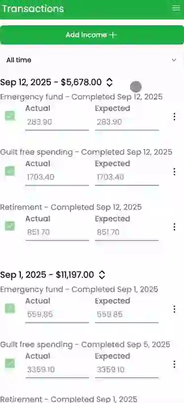 When you get income, log it. The app will create incomplete transactions automatically for you based on your buckets.